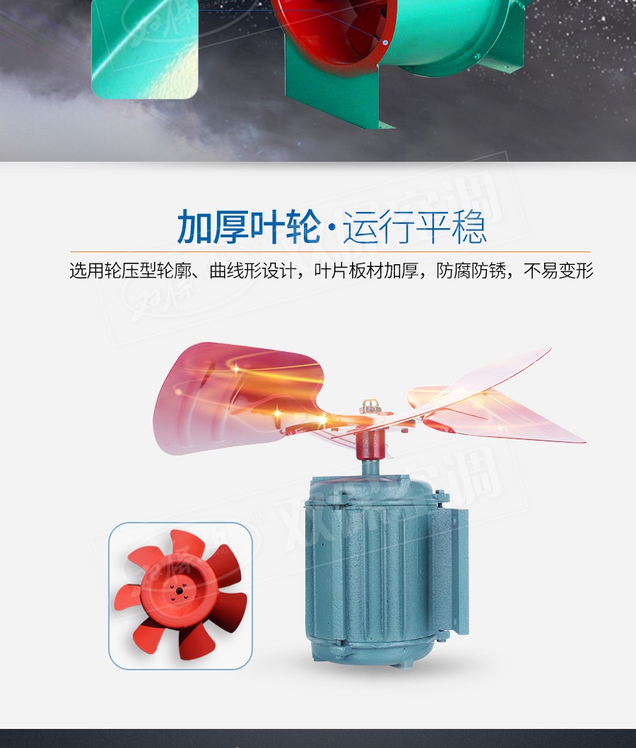 【風機特點】同型號斜流風機的風壓較混流風機高,該風機最適用于直管道加壓送風和排風。占地少、安裝方便(水平、垂直、吊裝均可)。